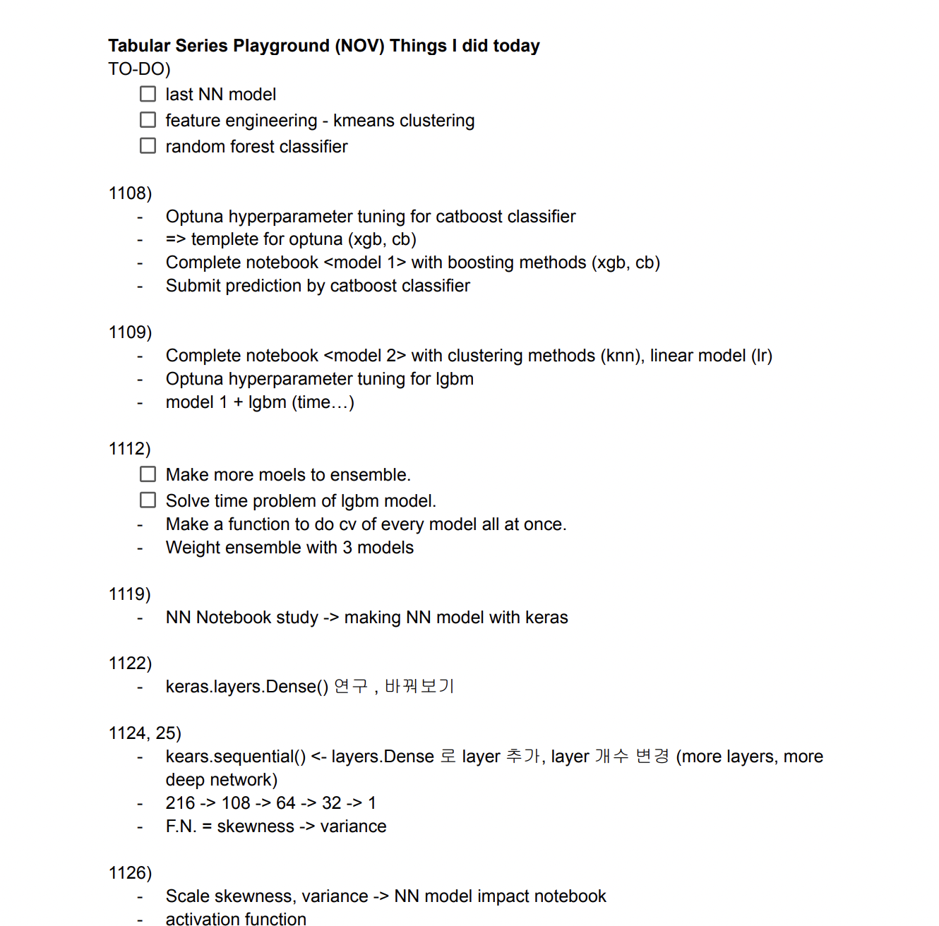 그리고 월말에는 거의 못해서 NN을 살짝 건드리고 대회가 끝이 났다. 디스커션에 있던 페이퍼들도 읽고 그러려고 했는데, 후반부가 흐지부지돼서 아쉽다. 12월에는 아예 tabular data + NN만 집중해서 풀어봐야겠다.